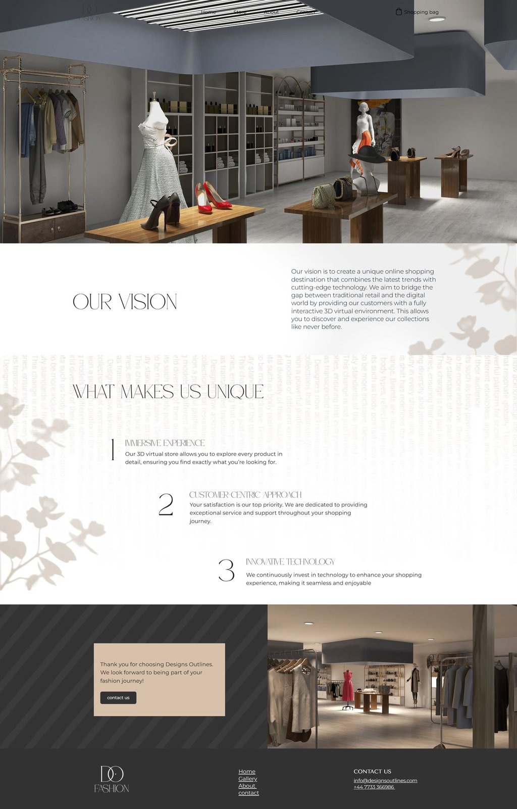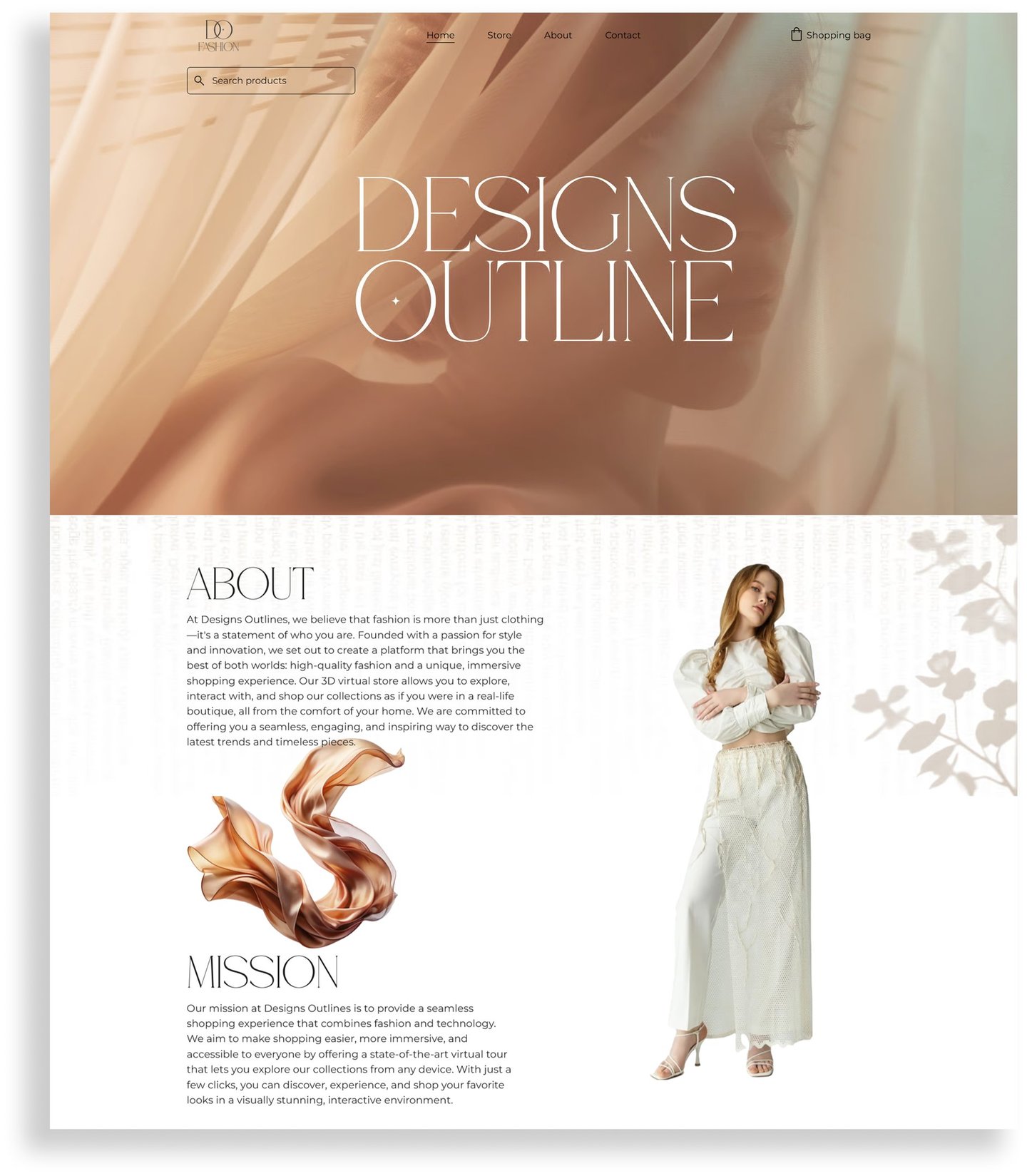 Designs Outlines is a fashion-forward e‑commerce platform that merges style with cutting-edge technology to deliver a vivid, interactive shopping experience. The site features a fully immersive 3D virtual store where you can navigate through curated collections just like strolling in a real boutique—from any device without downloads . Founded on a passion for innovation and quality, the brand showcases a range of high‑end fashion items and offers a seamless browsing experience, enabling users to click on products in the virtual space and instantly reach their purchase pages. With a mission to democratize immersive shopping, Designs Outlines aims to make fashion exploration effortless, engaging, and accessible to all by combining visually stunning design with intuitive virtual interactions